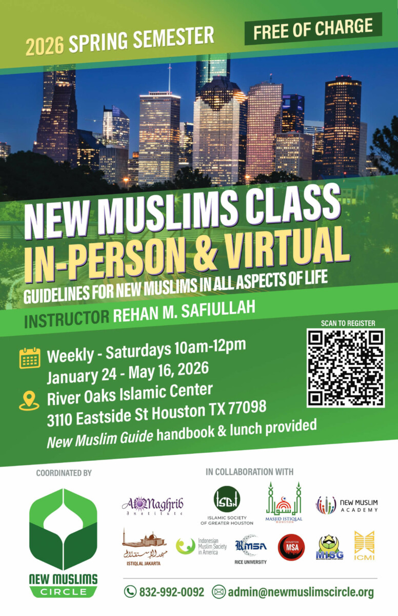 Please fill out the following to be enrolled in New Muslims Class – 2026 Spring Semester that will be held in-person and online every Saturday 10:00 AM – 12:00 PM. The in person class is located at ISGH Main Center, River Oaks 3110 East Side St Houston TX 77098.